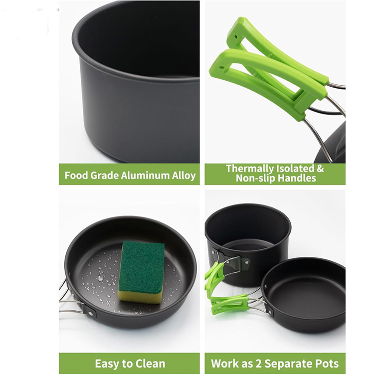 Oinarrizko aluminiozko aleazioz egina, estaldura ez-toxikoekin, sukaldeko tresnak beroaren banaketa berdina bermatzen du eta kanpamenduko suaren sukaldaritza jasaten du janaria prestatzeko seguru geratzen den bitartean.