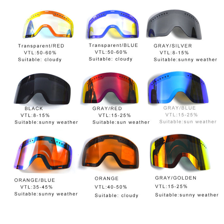Lainoaren aurkako UV magnetiko pertsonalizatuak 400 elurretako eskirako betaurreko dotoreak. Zure lehen mailako handizkako irtenbidea neguko kirol profesionaletarako. Eskirako betaurreko hauek lainoaren aurkako ispiluzko lenteak dituzte UV400 babes magnetiko pertsonalizatuarekin. Geruza bikoitzeko diseinu dotoreak argitasun eta erosotasun paregabeak bermatzen ditu elurretako eskiaren abentura guztietarako.
