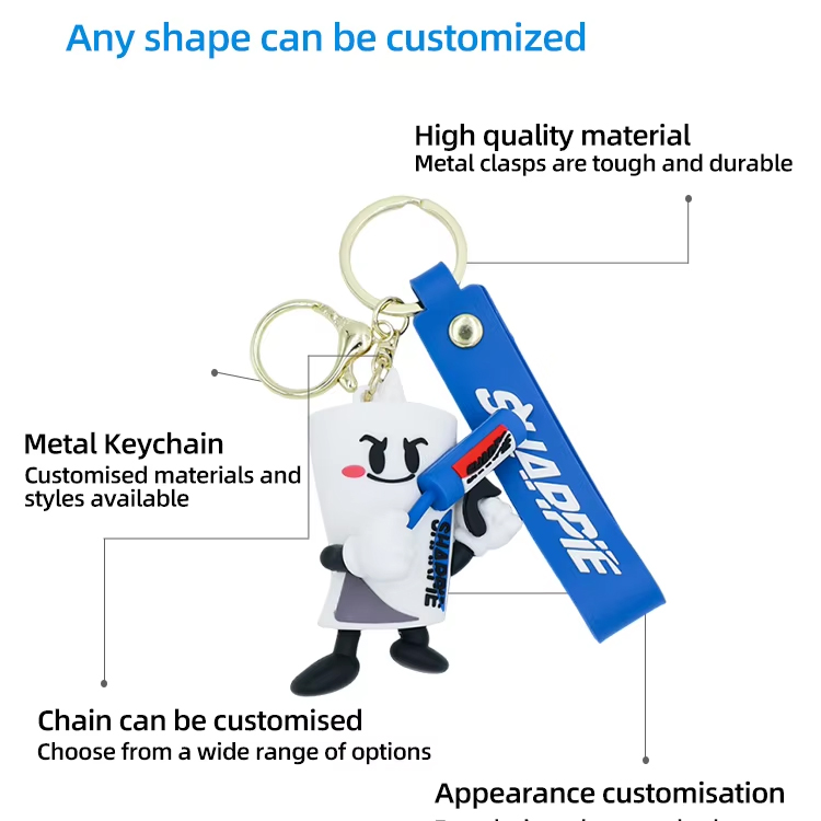 Eman zure marka edo ideiari bizitza guztiz pertsonalizatutako 2D edo 3D diseinuekin. Logotipoa, maskota edo leloa izan, gure PVCzko giltza leunak zure ikuspegia kolore biziarekin eta xehetasun handiekin bat egiteko egokituta daude.