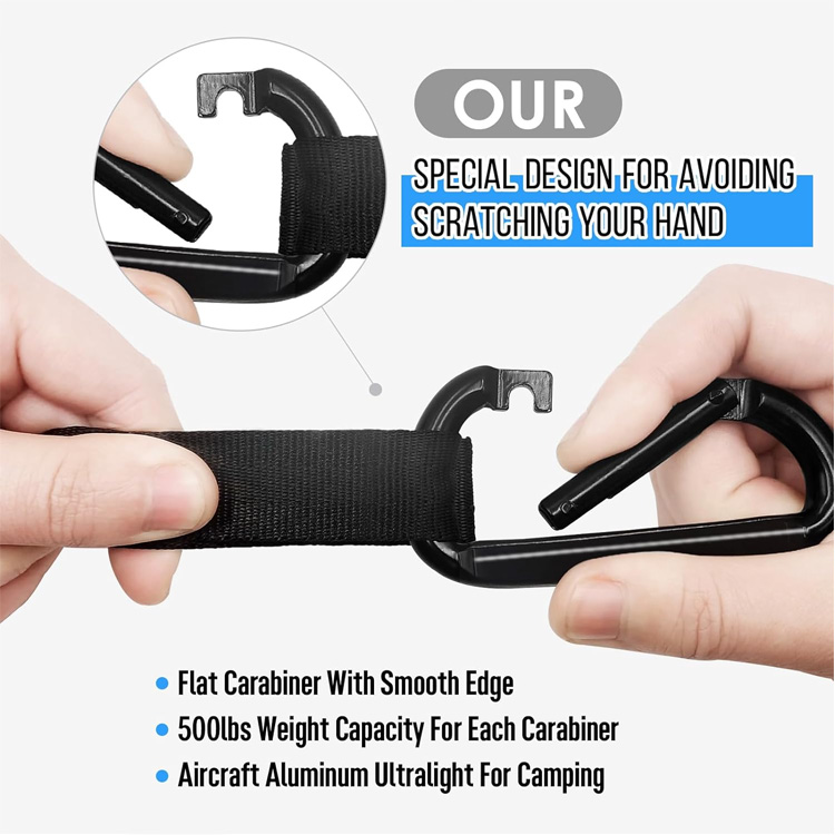 10 oineko zuhaitz erregulagarriko bi uhal ditu, 15+ begizta punturekin eta militar-mailako aluminiozko mosketoiekin, 12 eta 25 oin arteko zuhaitzetan instalatzeko modu seguruan azala kaltetu gabe.