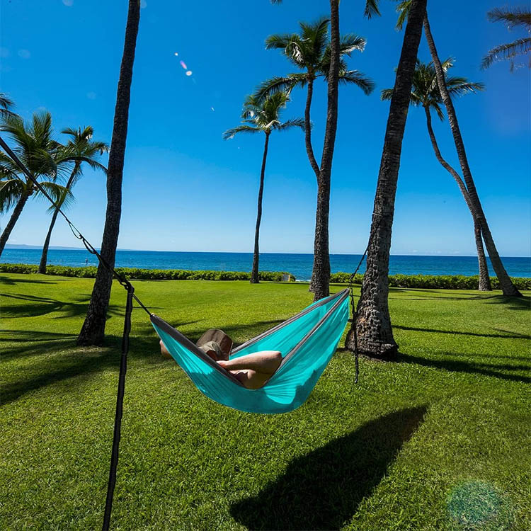 Diamantezko ehundura-eredua duen 70D ripstop nylon benetakoz egina, hamaka honek indarraren, transpiragarritasunaren eta lehortze azkarraren errendimenduaren oreka ezin hobea eskaintzen du hainbat eguraldi-baldintzetarako.