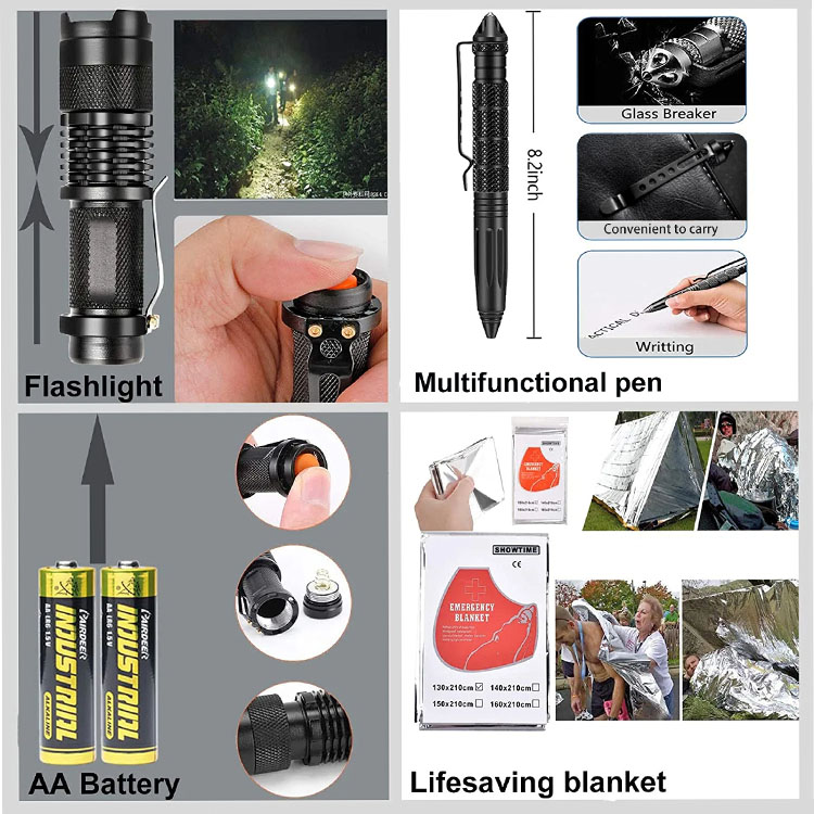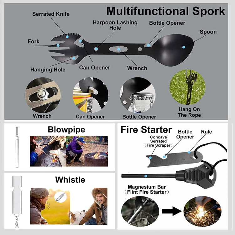 Biziraupenerako ekipamendu handizkako ekipamendua Kanpalekuan Ibilaldiak Arrantza Ehizarako. Zure azkeneko biziraupenerako irtenbidea Kanpoko abenturetarako. Ekipamendu-kit integral honek Larrialdietarako Iheserako Aizkora, Seinalezko Txistua eta Su-pizgailu fidagarria ditu. Kanpin, mendi-ibiliak, arrantza eta ehizarako diseinatuta, egoera kritikoetan ahalik eta gehien prestatzea bermatzen du.